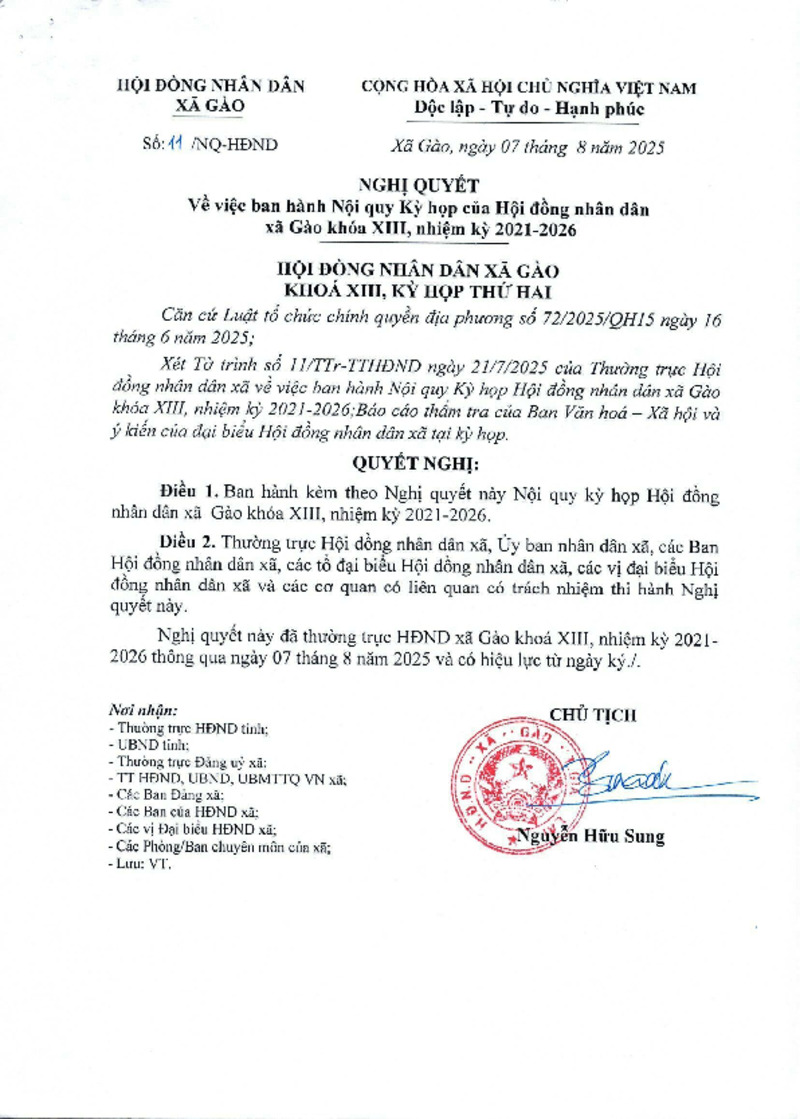 NGHỊ QUYẾT Về việc ban hành Nội quy Kỳ họp của Hội đồng nhân dân xã Gào khóa XIII, nhiệm kỳ 2021-2026 17/10/2025, 12:11:42 - Lượt xem: 1 Tweet Thêm vào danh sách Báo xấu Thông tin tài liệu NGHỊ QUYẾT Về việc ban hành Nội quy Kỳ họp của Hội đồng nhân dân xã Gào khóa XIII, nhiệm kỳ 2021-2026